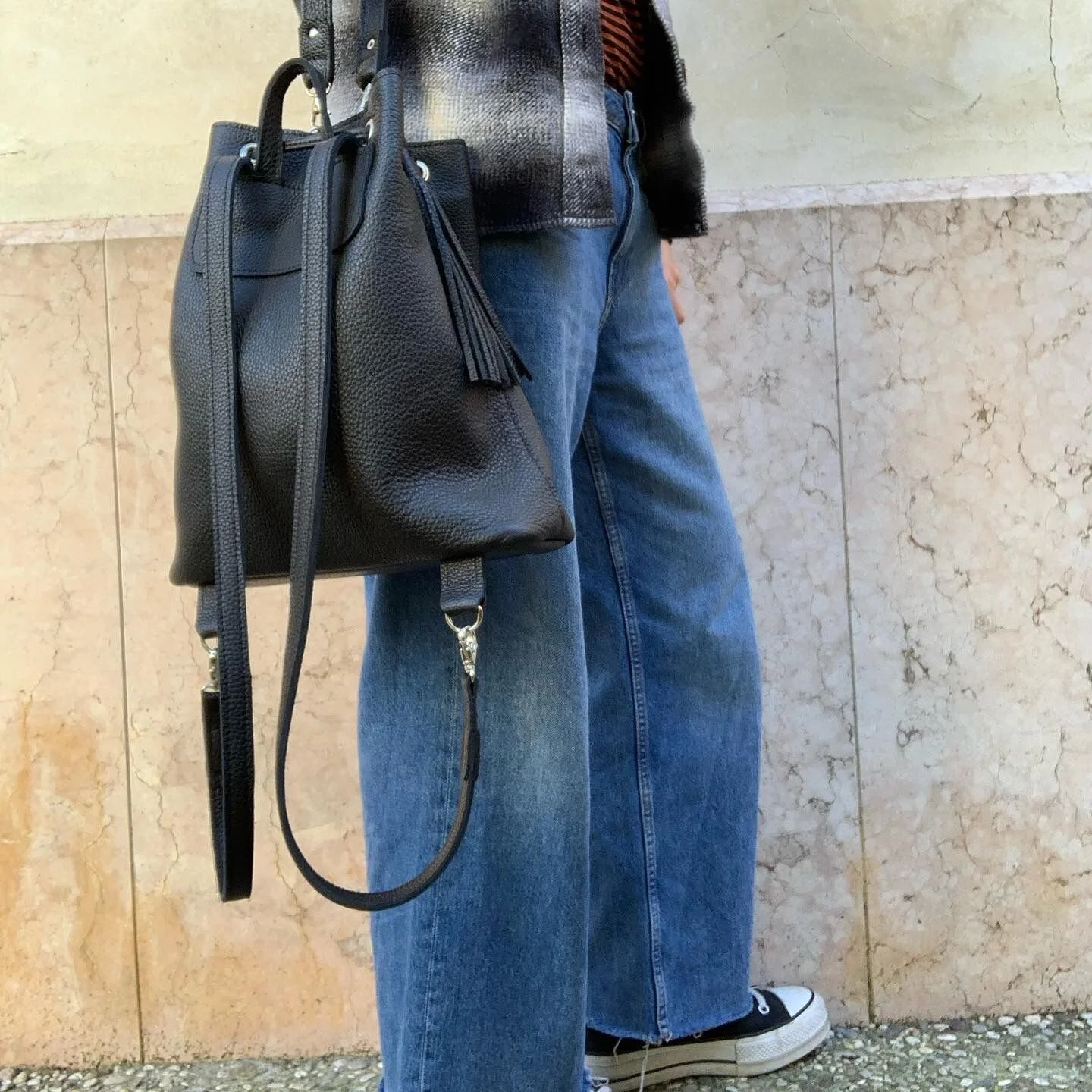 zaino borsa altezza 36 base 30X9 fodera in cotone , tasca in pelle, moschettone per chiavi e personalizzazione con iniziali prezzo 145€